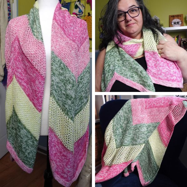The Chevron Adventure Wrap works best with a color-changing yarn that has long color changes….