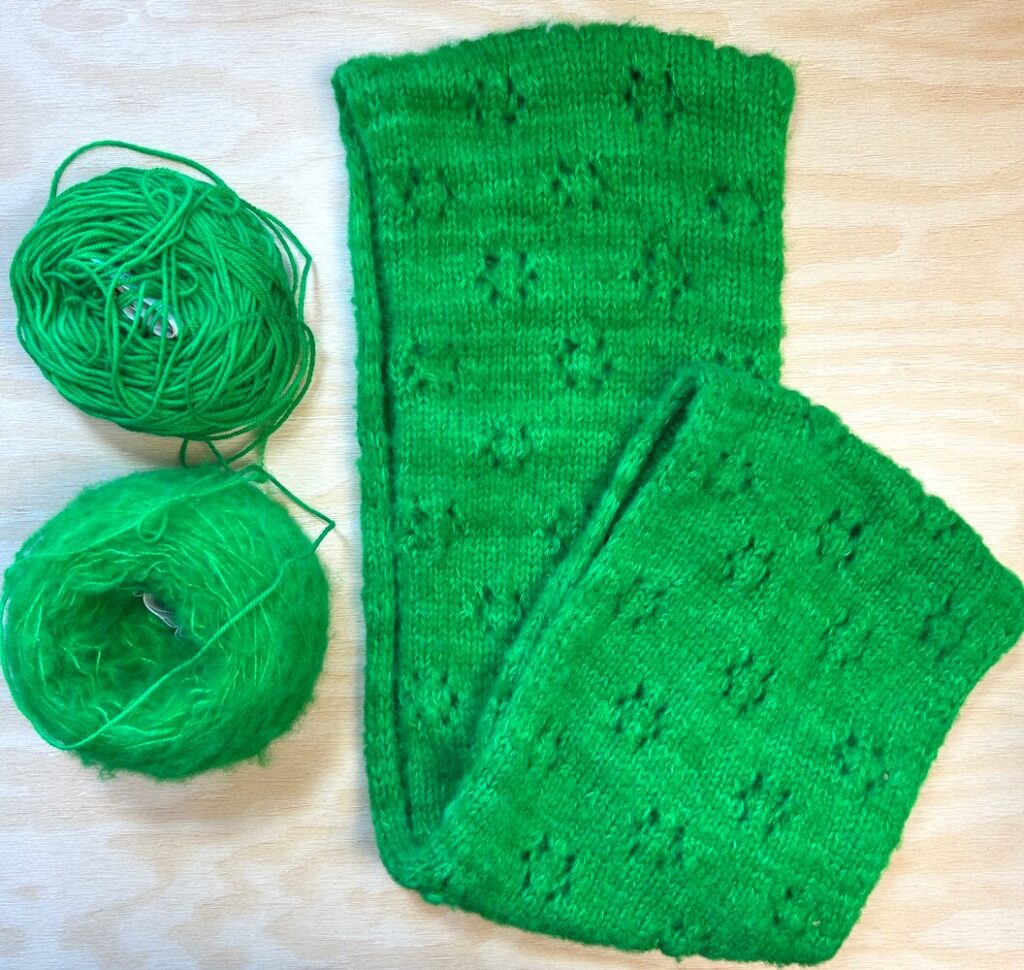 The cowl is knit lengthwise and then the provisional cast on stitches and final row are joined with a Kitchener graft. The pattern is a simple lace pattern on a background of Stockinette stitch with a 3-stitch I-cord edge at each side. When the ends are sewn together, it creates a completely seamless loop.