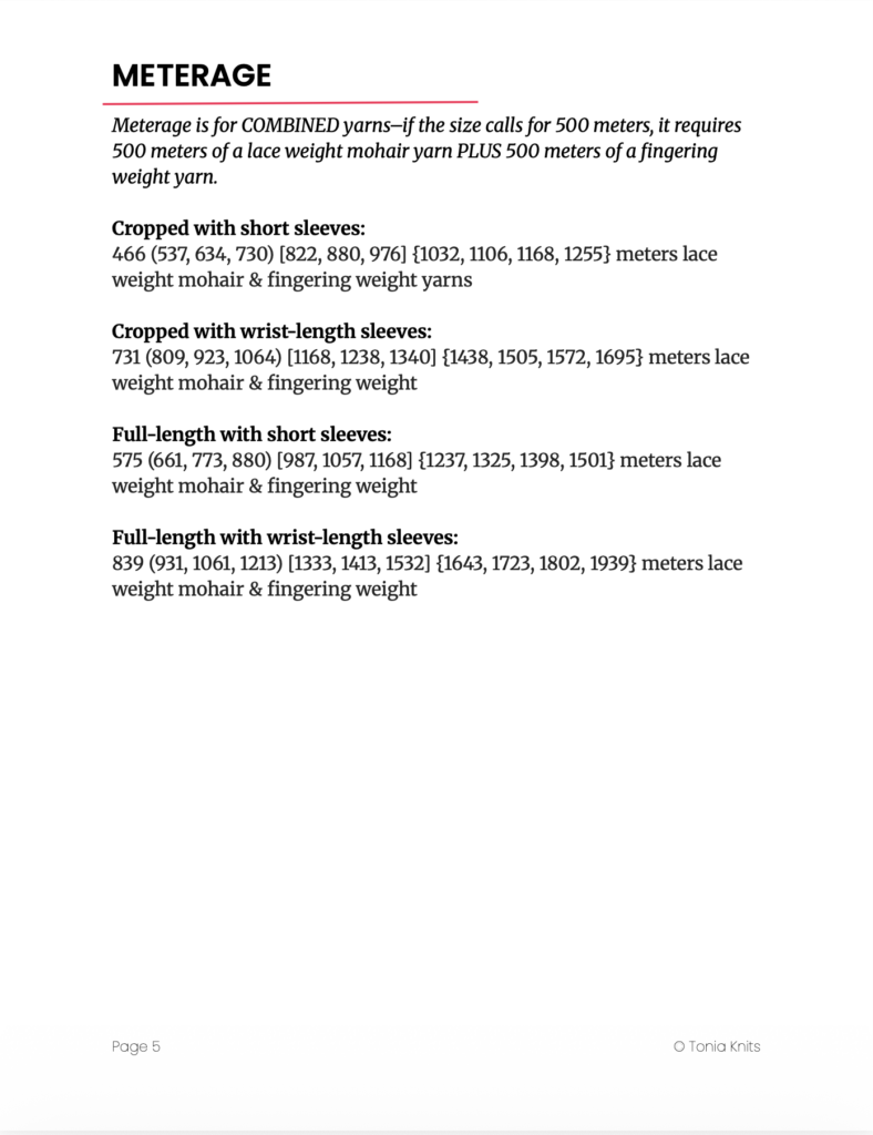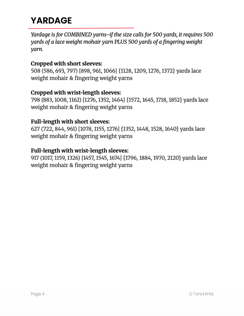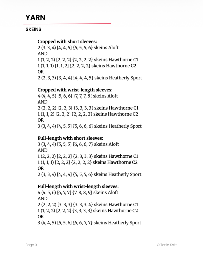 Amounts listed below are approximate. Total yarn requirements will vary depending on the type of yarn used, gauge, and any alternations you may choose to make.