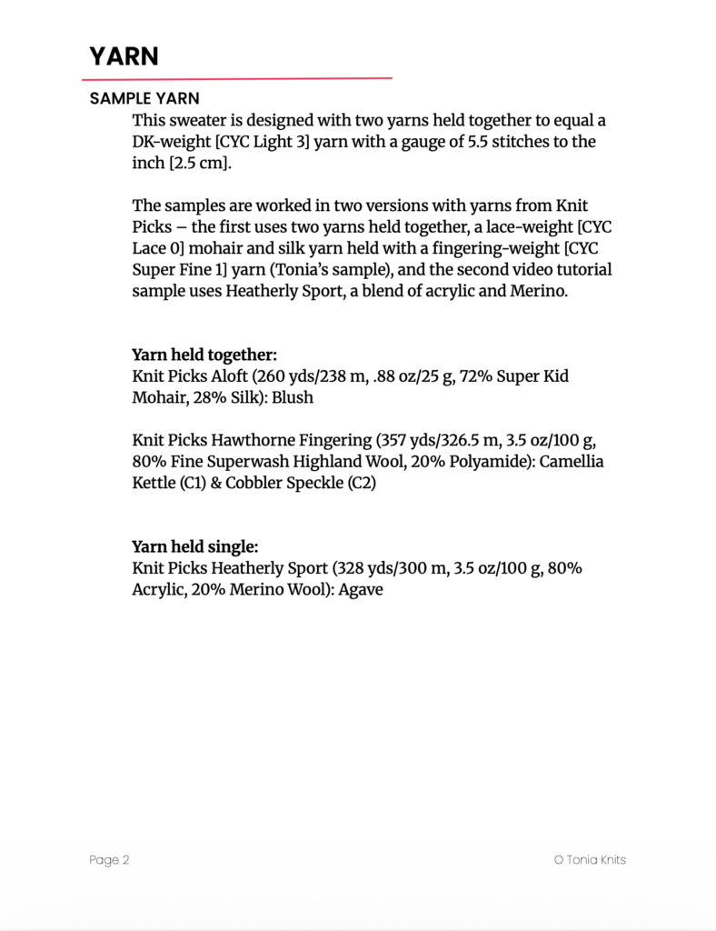 The samples are worked in two version with yarns from Knit Picks – the first uses two yarns held together, a lace-weight [CYC Lace 0] mohair and silk yarn held with a fingering-weight [CYC Super Fine 1] yarn (Tonia’s sample), and the second video tutorial sample uses Heatherly Sport, a blend of acrylic and Merino.