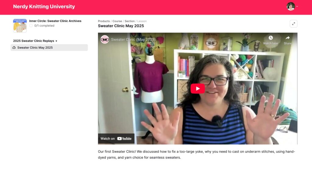 Get an inside-look at the private membership – with Knit Nights, Sweater Clinics, workshops, make-alongs, and more! After purchasing the course, you’ll find a special link to join the membership with a 30-day FREE trial right in your course dashboard.