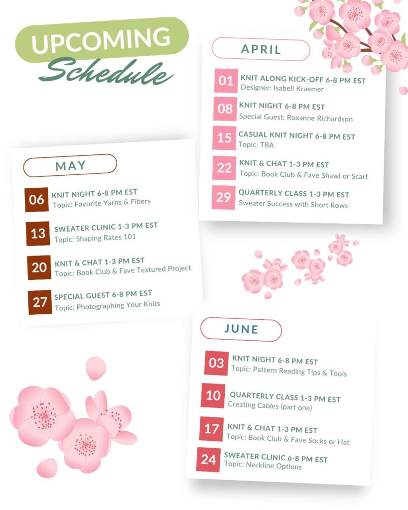 It’s ongoing, not one-and-done. You’ll get real-time knitting support both on our Zoom video meetings and in the community. On top of that, you get access to all the past meetings – Sweater Clinics, Quarterly Classes, and more!